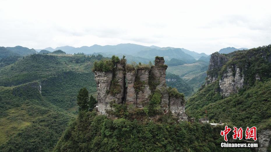 10月4日,航拍七柱山宛如巨大“手掌”。“七柱山”位于贵州省务川仡佬族苗族自治县黄都镇丝棉村境内,经过上亿年的风化剥蚀,显现出七柱并排的景象。中新社记者 瞿宏伦 摄