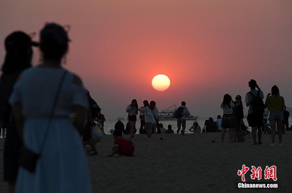 10月4日傍晚,游客在厦门海岸边观看落日美景。国庆黄金周长假里,日落时分的厦门美如画,吸引了许多来厦门度假的游客驻足观赏。中新社记者 张斌 摄