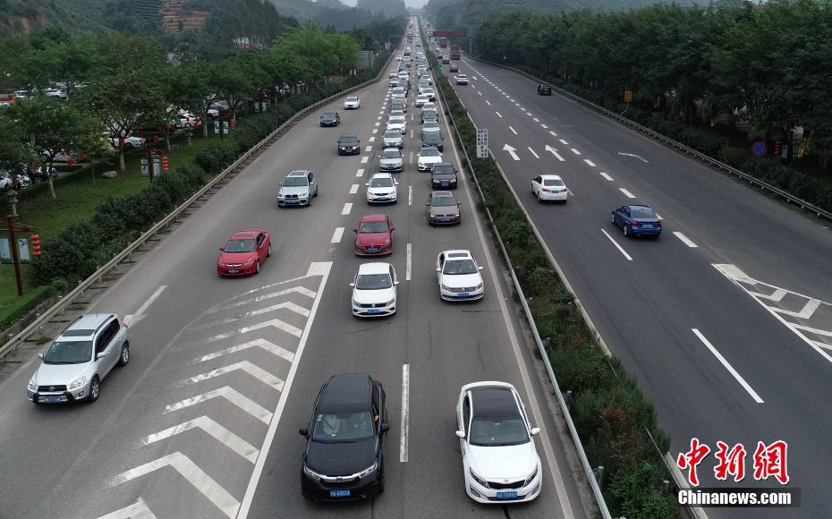 10月5日,四川境内的成雅、雅西、雅康、成乐等多条高速公路返程车流增大,部分路段拥堵,行进缓慢。图为四川高速公路迎来返程高峰,公路上车辆行进缓慢。中新社记者 刘忠俊 摄