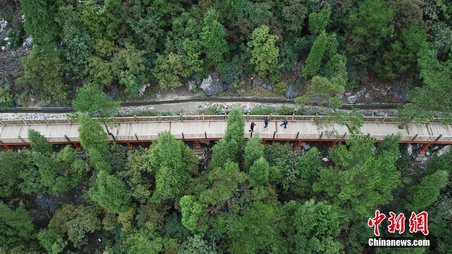 10月5日,大发渠边上修建的观光栈道。当日,国庆黄金周期间,位于贵州省遵义市播州区平正乡的大发渠吸引了众多游客前来旅游观光。大发渠是当地老支书黄大发历时36年带领当地村民过三道绝壁开凿出来的水渠。而今,在贵州金融企业的帮扶下,大发渠和其所在地草王坝经过重新改造利用,已经从“救命”水渠转变为农旅融合发展的“致富”金渠。中新社记者 瞿宏伦 摄