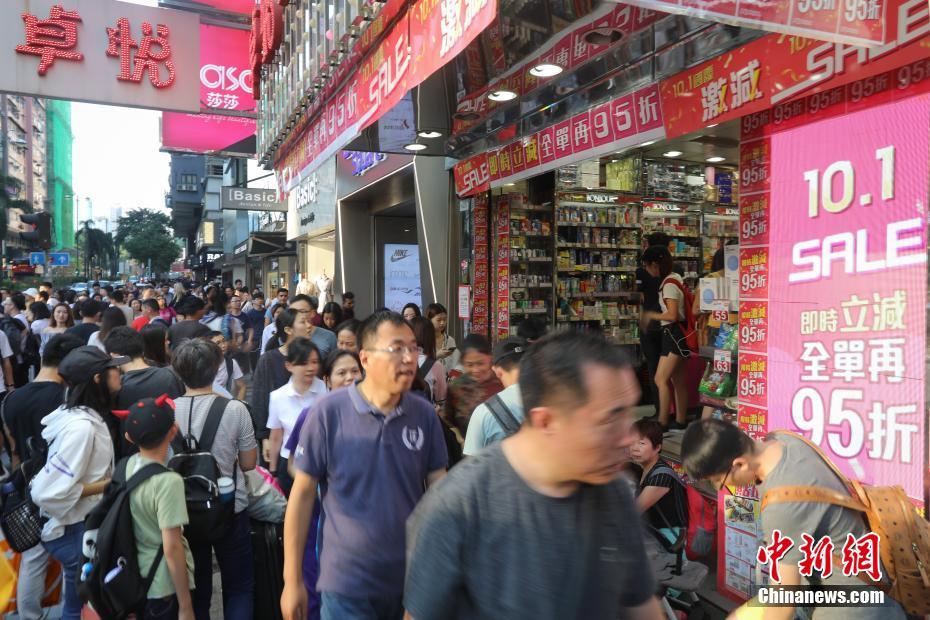 10月5日,香港的旅游购物胜地尖沙咀游客爆满,不少商家针对国庆黄金周也推出了打折优惠措施吸引顾客。据香港特区政府入境事务处公布的数据,10月1日至4日,香港出入境人数累计达383万人次,比去年同期增长近9%;其中通过高铁西九龙站出入境的旅客超过30万人次。中新社记者 谢光磊 摄