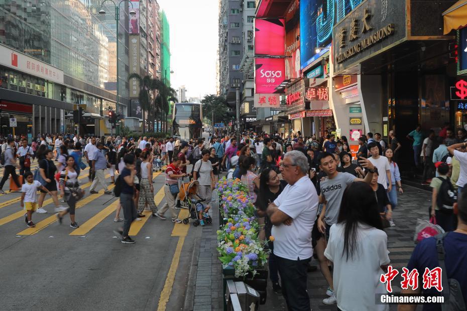 10月5日,香港的旅游购物胜地尖沙咀游客爆满,众多中国内地游客挤满尖沙咀弥敦道的购物商场。据香港特区政府入境事务处公布的数据,10月1日至4日,香港出入境人数累计达383万人次,比去年同期增长近9%;其中通过高铁西九龙站出入境的旅客超过30万人次。中新社记者 谢光磊 摄