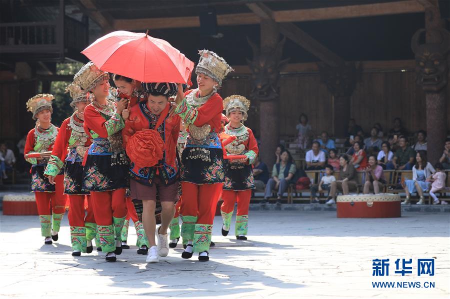 10月5日,在湖南省湘西土家族苗族自治州吉首市德夯苗寨,苗族同胞为游客表演苗族婚俗。 新华社发(彭彪 摄)