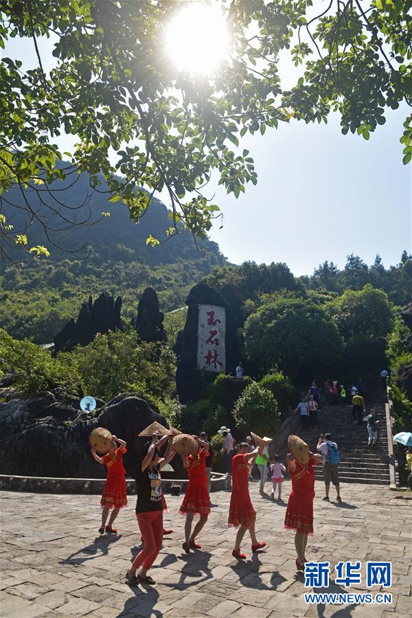 10月5日,游客在贺州市玉石林景区与演员一起跳“斗笠舞”。 国庆长假期间,广西贺州市玉石林景区用从各地收集到的300多种、千余顶造型各异的斗笠装扮景区,吸引不少游客前来观赏。 新华社发(黄旭胡 摄)