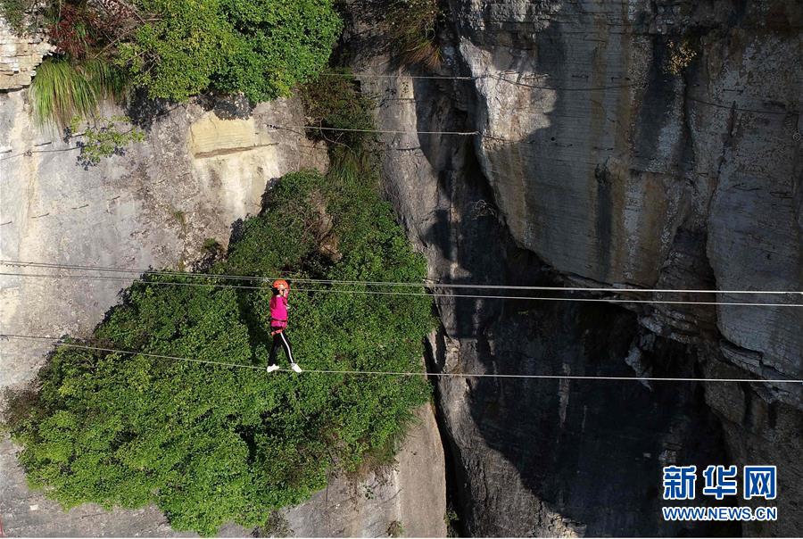 10月5日,游人在湖北省建始县花坪镇鸡公岭飞拉达攀岩户外运动基地走钢丝桥(无人机拍摄)。 新华社发(杨顺丕 摄)