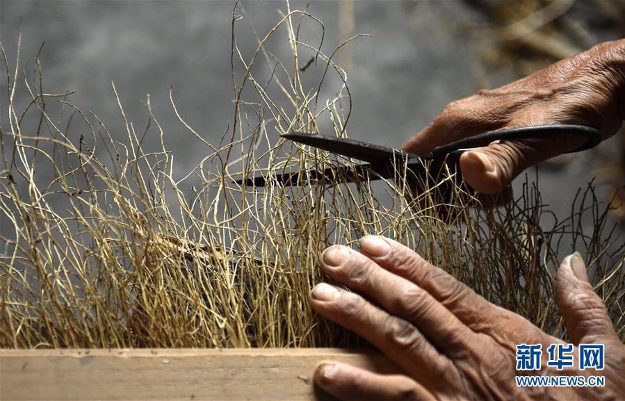 10月7日,杨汉林在修剪制作好的扫帚。新华社发(宋文 摄)