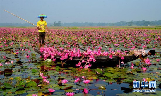 10月7日,在孟加拉国巴里萨尔地区,当地居民在采摘睡莲。 近日,孟加拉国巴里萨尔地区的睡莲进入盛开时节。 新华社发(萨利姆·礼萨 摄)