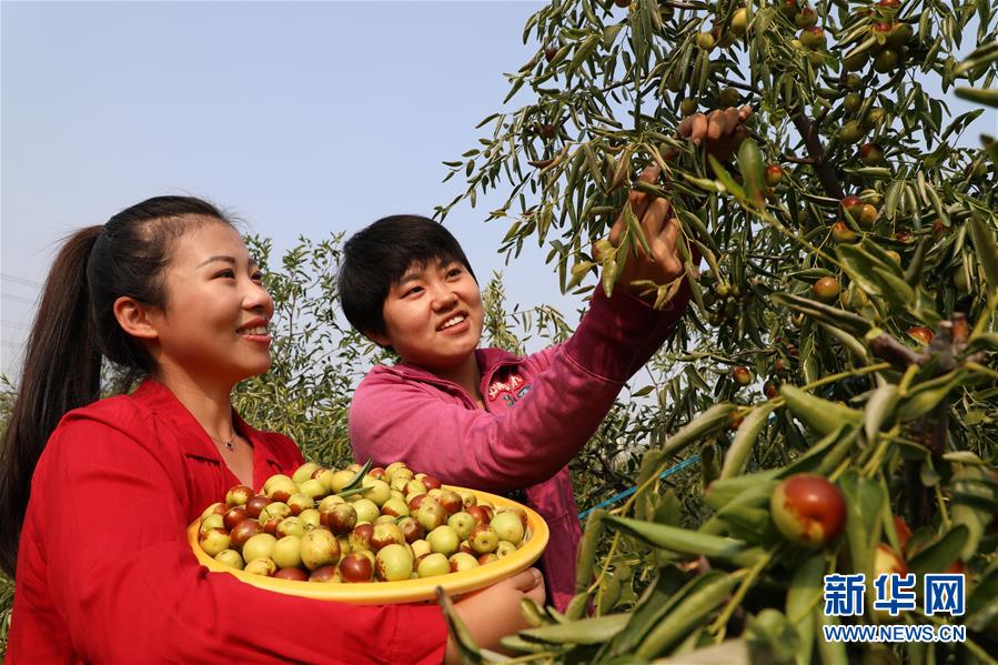 10月8日,游客在滨州市沾化区冬枣园里采摘冬枣。 金秋十月,山东省滨州市沾化区50万亩冬枣进入采摘期,当地枣农抓紧采摘、分拣、包装、销售,呈现一片丰收景象。 新华社发(贾海宁 摄)