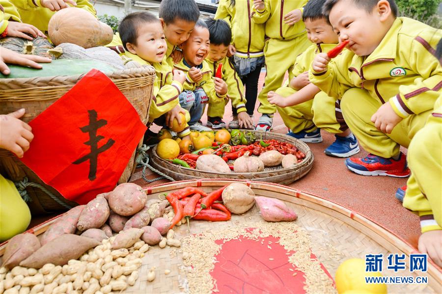 10月10日,孩子们“晾晒”采收的农作物。当日,浙江省长兴县泗安镇中心幼儿园举行“晒秋”活动,老师和孩子们共同进行农作物的采收、晾晒等游戏,体验丰收晒秋的快乐。新华社发(谭云俸 摄)