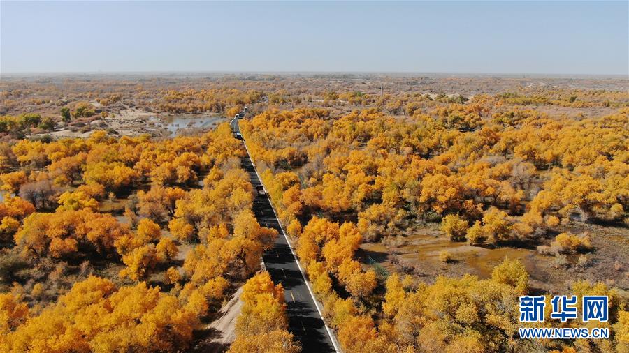 这是在内蒙古自治区额济纳旗拍摄的胡杨林(10月10日无人机拍摄)。 金秋时节,内蒙古自治区额济纳旗胡杨林如同披上金装,成为大漠中的一抹亮色,吸引众多中外游客前来观赏游玩。 新华社记者邹予摄