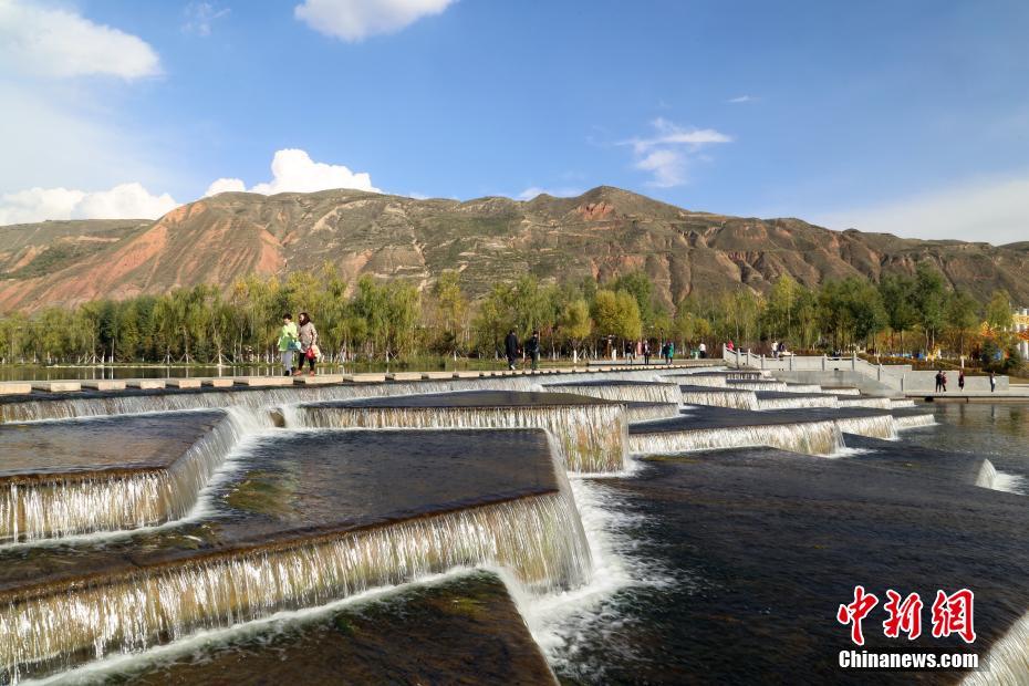 10月10日,北川河湿地公园内,民众行走在阶梯式水域区域。据了解,北川河湿地公园是西宁市面积最大的湿地公园,总面积约173.5公顷,整个水域面积约为95公顷,绿化面积约为60公顷,水景和绿景占全园面积的70%以上,拥有六个湖,五大园区。该湿地公园的的建成对西宁这样一座高寒高海拔干旱地区城市来说,有利于气候环境的改善。中新社记者 马铭言 摄