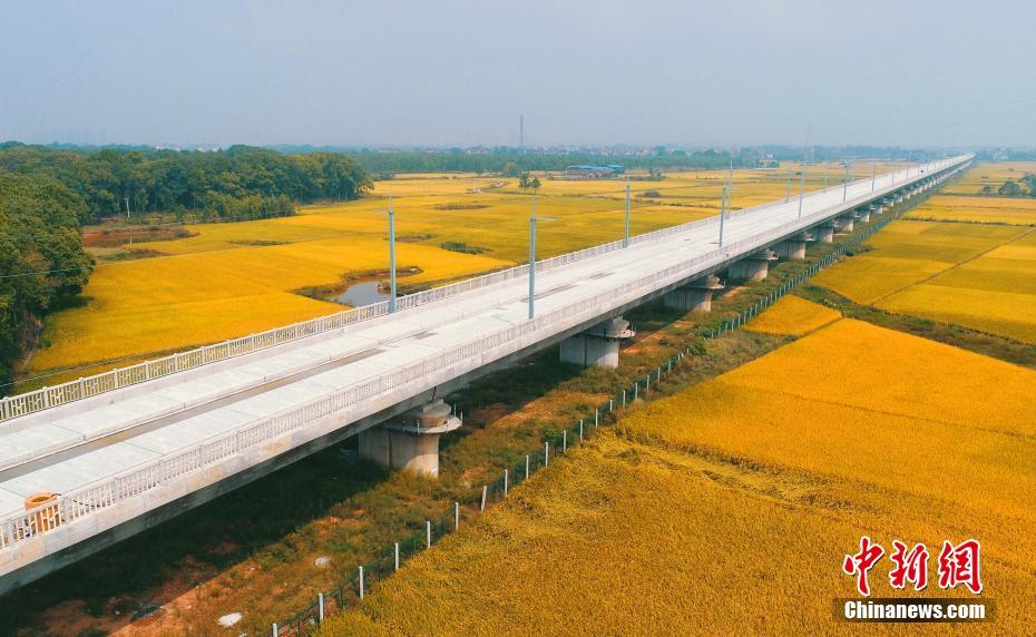 10月11日,由中铁十六局集团三公司承建的昌赣高铁泰和赣江特大桥引桥正在施工中。空中俯瞰,大桥像一条长长的白色巨龙,穿越金黄色的稻田,构成了一幅独特的深秋彩画。昌赣高铁泰和赣江特大桥位于江西泰和县境内,设计时速350公里,全长6.839公里,是全线的控制性工程之一。昌赣高铁北起江西省会南昌,南抵赣州,线路全长416.102公里,设计时速350公里。邓和平 摄