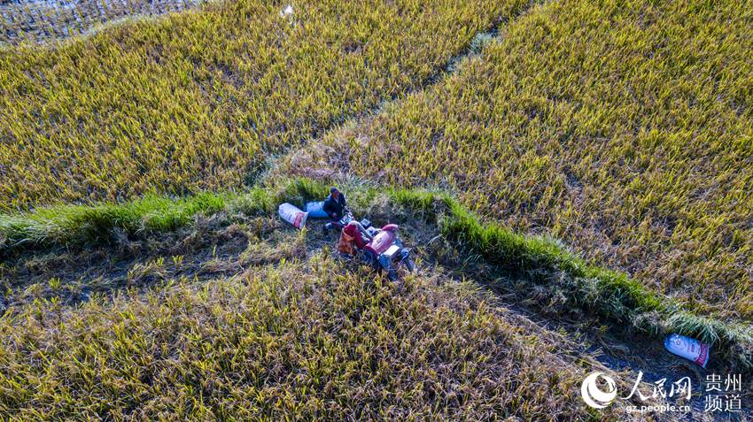人民网务川10月12日电 10月11日,贵州省务川仡佬族苗族自治县丰乐镇村民抓住天气放晴的时机抢收水稻,一片繁忙。(田东)