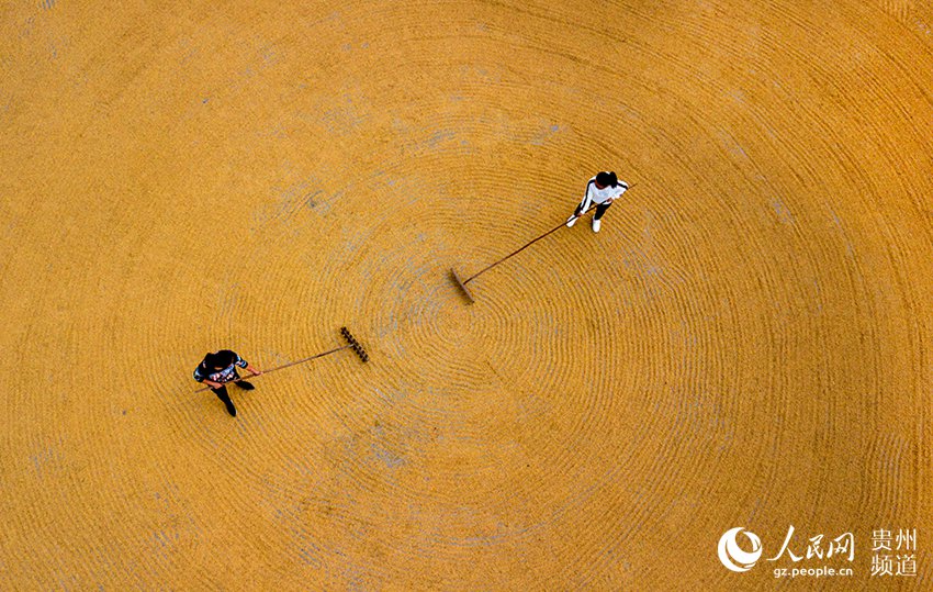 务川自治县丰乐镇村民抢收稻谷(无人机拍摄)。田东 摄