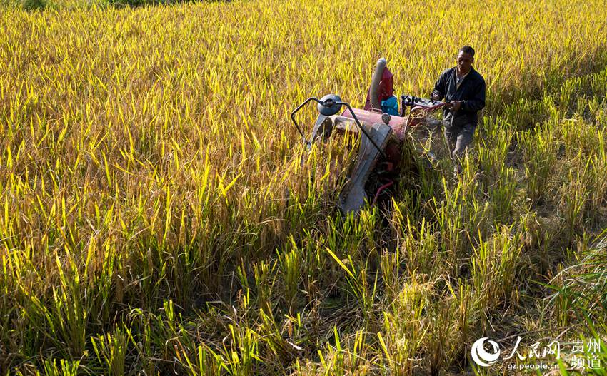 人民网务川10月12日电 10月11日,贵州省务川仡佬族苗族自治县丰乐镇村民抓住天气放晴的时机抢收水稻,一片繁忙。(田东)
