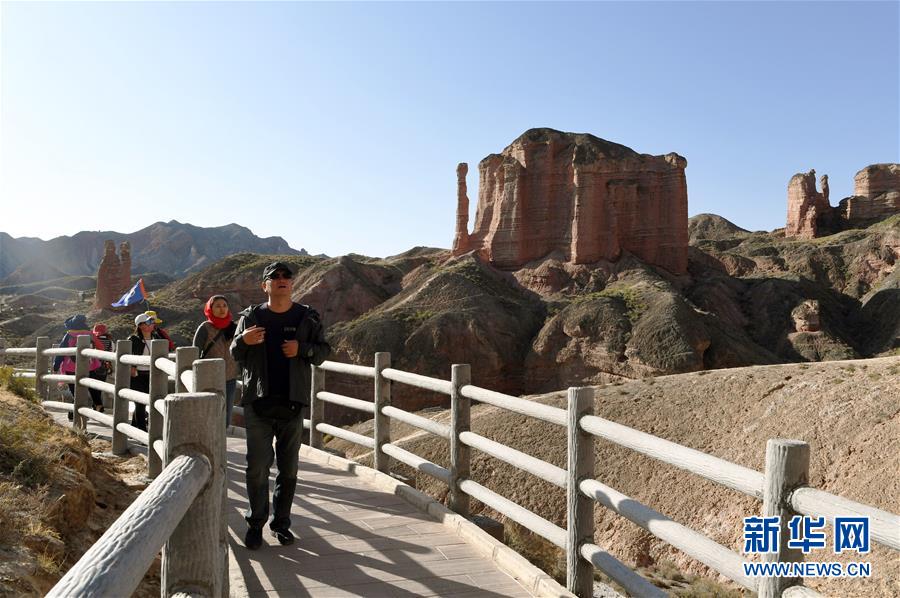 10月12日,游客在甘肃冰沟丹霞景区参观丹霞地貌。 深秋时节,甘肃省张掖市肃南裕固族自治县境内的冰沟丹霞景区吸引大批游客前来观光。 新华社记者 范培珅 摄