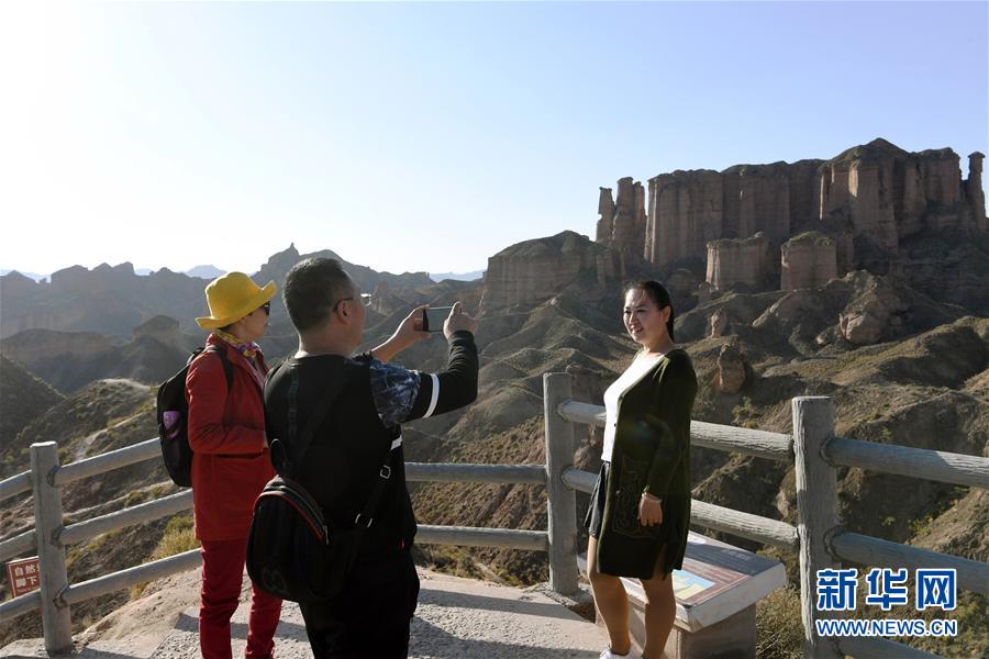 10月12日,游客在甘肃冰沟丹霞景区拍照留念。 深秋时节,甘肃省张掖市肃南裕固族自治县境内的冰沟丹霞景区吸引大批游客前来观光。 新华社记者 范培珅 摄