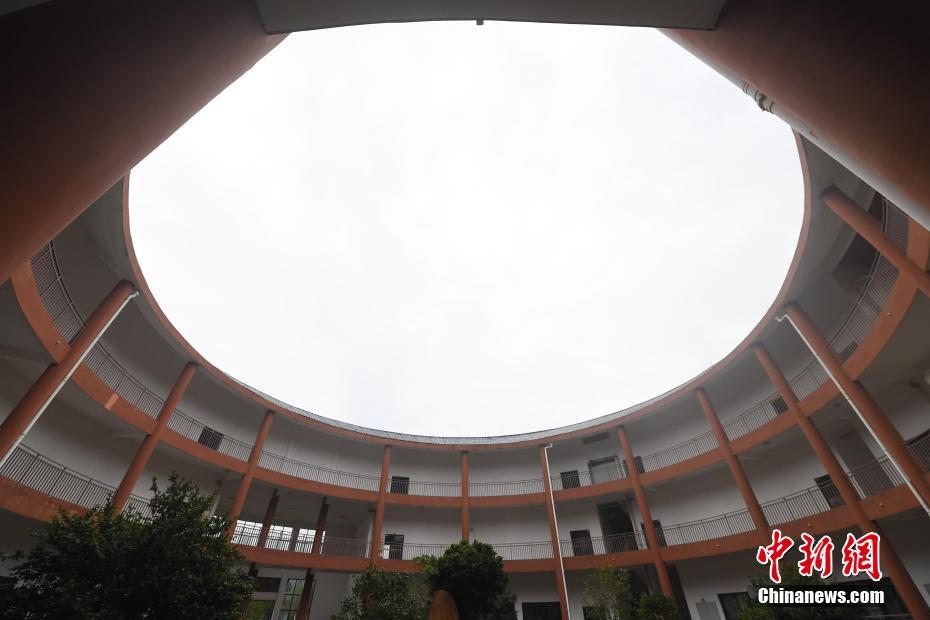10月14日,福建永定一高速公路服务区内建筑酷似世界文化遗产“福建土楼”,成为高速路上一景。上图为高速公路服务区建筑内景;下图为位于福建永定的客家土楼内景。(拼版图片) 中新社记者 张斌 摄