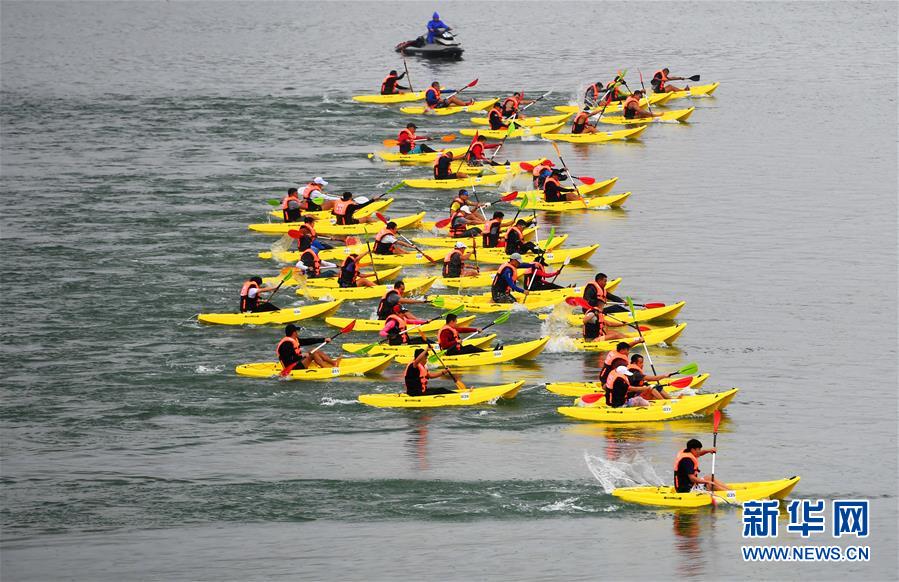 10月14日,在广西柳州市静兰水上运动基地,皮划艇爱好者迎着秋雨在江面上角逐。 新华社发(黎寒池 摄)