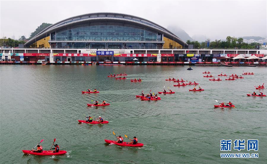 10月14日,在广西柳州市静兰水上运动基地,皮划艇爱好者迎着秋雨在江面上角逐(无人机拍摄)。 新华社发(黎寒池 摄)