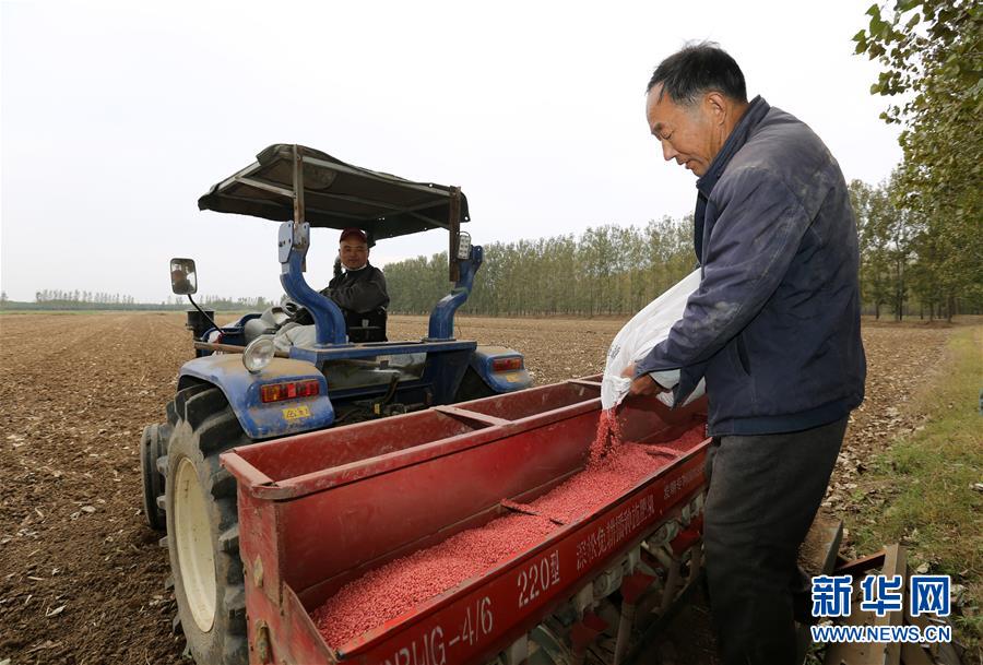 10月14日,山东省临沂市郯城县会义家庭农场场长王会义(右)向农机里倒麦种。秋耕麦播时节,山东临沂、聊城等地的家庭农场开始忙碌,农民们抢抓农时播种小麦,田间一派秋耕图景。新华社发(张春雷 摄)
