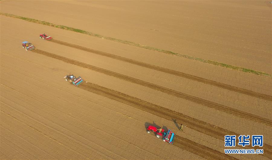 10月14日,在山东省聊城市茌平县贾寨镇郑庄村祥丰家庭农场,农机手驾驶农机播种小麦(无人机拍摄)。秋耕麦播时节,山东临沂、聊城等地的家庭农场开始忙碌,农民们抢抓农时播种小麦,田间一派秋耕图景。新华社发(赵玉国 摄)