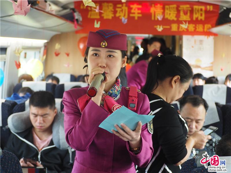 11点30分,C6409次列车始发后不久,值乘该次动车的乘务员王婷婷对前来参加活动的旅客致欢迎辞,活动由此拉开了序幕。她首当其冲地朗诵了《采桑子 重阳》,为后面的活动抛砖引玉,“人生易老天难老,岁岁重阳……一年一度秋风劲,不似春光。胜似春光,廖廓江天万里霜。” 王婷婷满怀深情的朗诵赢得了满堂的喝彩。