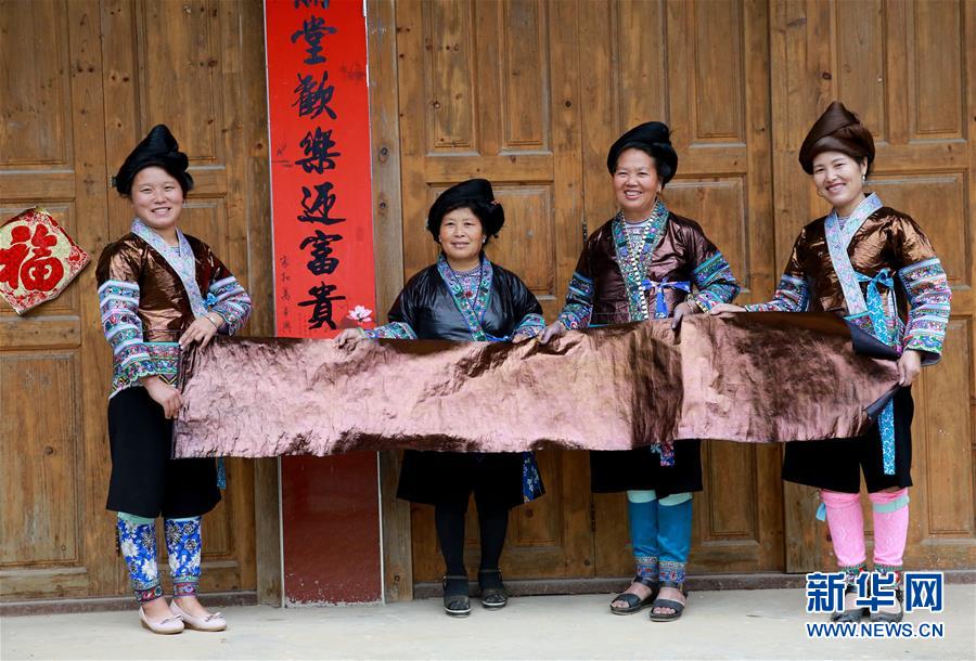 10月13日,在广西融水苗族自治县红水乡黄奈苗寨,穿着亮布衣的苗族妇女展示一块传统亮布。