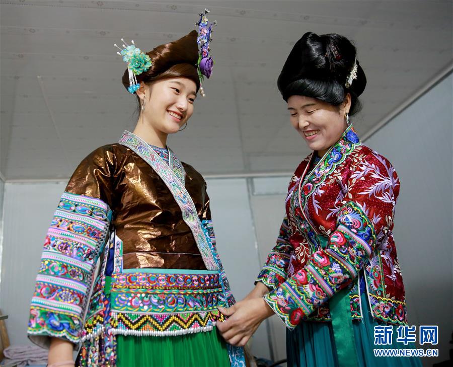 10月14日,在广西融水苗族自治县红水乡黄奈苗寨,苗族妇女在试穿刚缝制好的亮布衣。 新华社发(龙涛 摄)