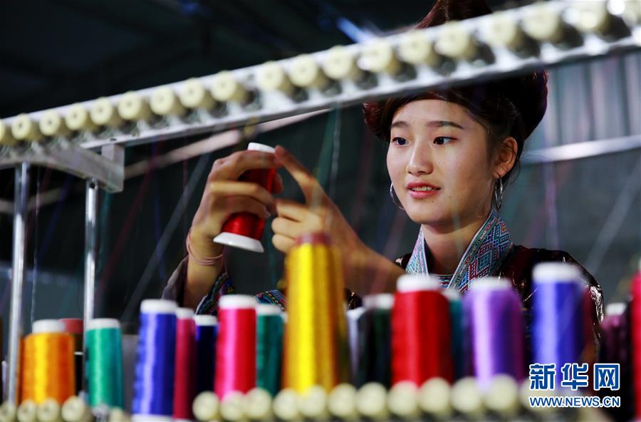 10月14日,在广西融水苗族自治县红水乡黄奈苗寨,苗族妇女在绣花机上装丝线。 新华社发(龙涛 摄)