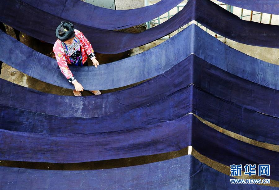 10月13日,在广西融水苗族自治县红水乡黄奈苗寨,苗族妇女在晾晒染过的棉布。 新华社发(龙涛 摄)