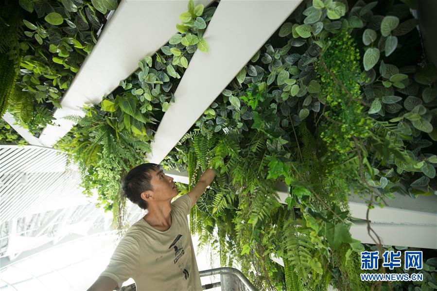 工作人员在联合国世界地理信息大会会址——德清国际会议中心布置内饰(9月19日摄)。 新华社记者翁忻旸摄