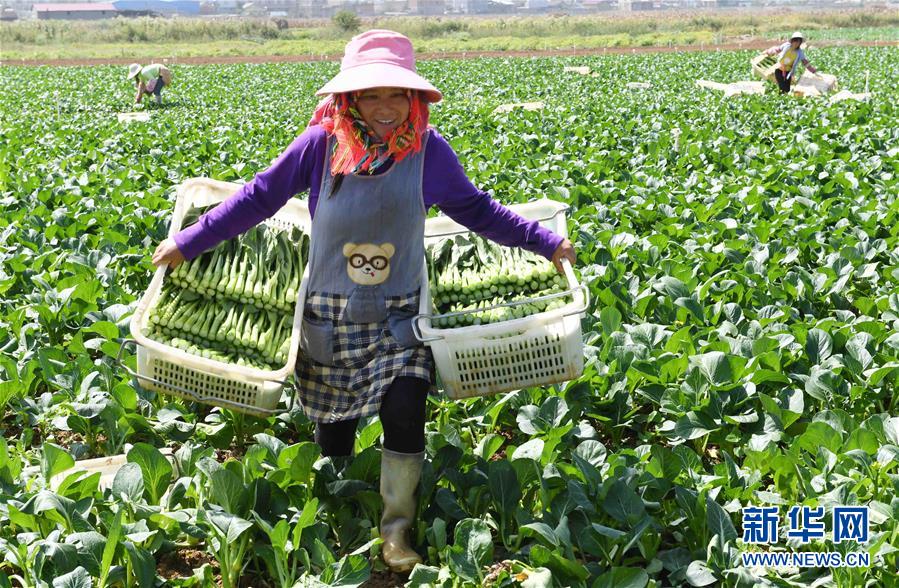 10月16日,砚山县小补佐村的村民在种植基地收菜。 云南省文山壮族苗族自治州砚山县稼依镇小补佐村有55户200多名壮族群众曾经居住在大山深处。2017年10月,在政府的帮扶下,小补佐村易地扶贫建设新村,村民全部搬迁入住新居。 新华社记者 杨宗友 摄