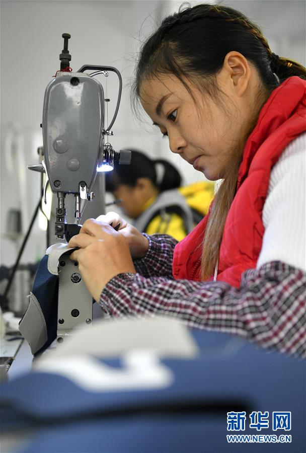 10月16日,在湖北省宣恩县李家河镇塘坊安置点的“微工厂”里,安置农民在加工鞋帮。 新华社发(宋文 摄)