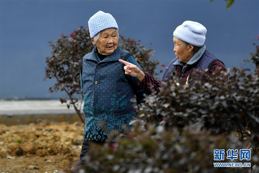 10月16日,在湖北省宣恩县李家河镇塘坊安置点,农民杨兰珍(左)、覃白云在安置小区里散步。 新华社发(宋文 摄)