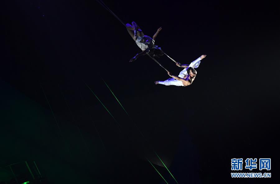 10月16日,演员在濮阳国际杂技艺术节上表演杂技《男女双人秋千》。 新华社记者 朱祥 摄