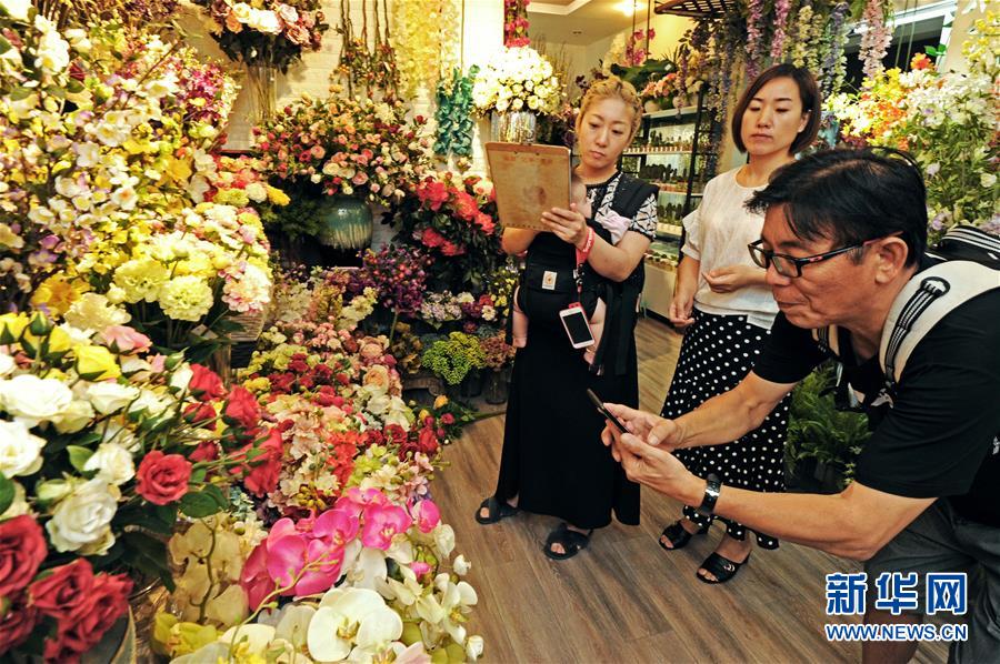 日本客商田口喜启(右)在浙江义乌国际商贸城拍摄仿真花样品(9月10日摄)。 据杭州海关统计数据,2018年前三季度,浙江省进出口总值2.11万亿元,同比增长12.5%。其中出口1.57万亿元,同比增长9.7%;进口5447.2亿元,同比增长21.4%。 新华社记者 谭进 摄