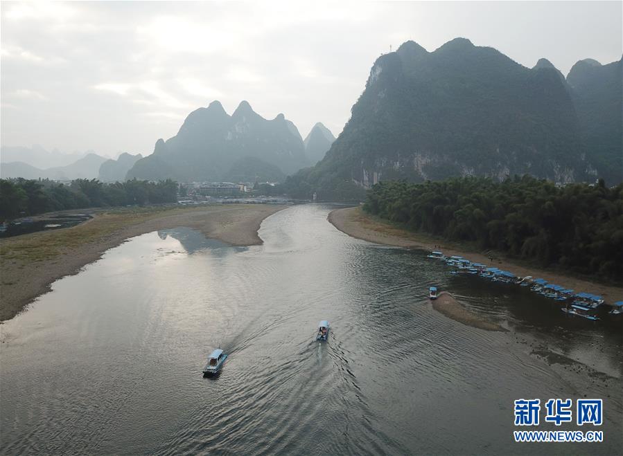 这是广西桂林市阳朔县兴坪镇漓江风光(10月18日无人机拍摄)。 江作青罗带,山如碧玉簪。1100多年前,唐朝诗人韩愈写尽桂林山水之美。千百年来,桂林的青山绿水成为历朝历代文人骚客笔下的“人间仙境”。 保护好桂林山水,既是对祖国大好河山负责,更是对历史负责。近年来,尤其是党的十八大以来,桂林严守生态底线,以前所未有的力度截污治河,保护漓江最美山水,推动城乡统筹协调发展,不断扩大对外开放合作力度,努力在青山绿水里走出一条生态文明路。 新华社记者 周华 摄