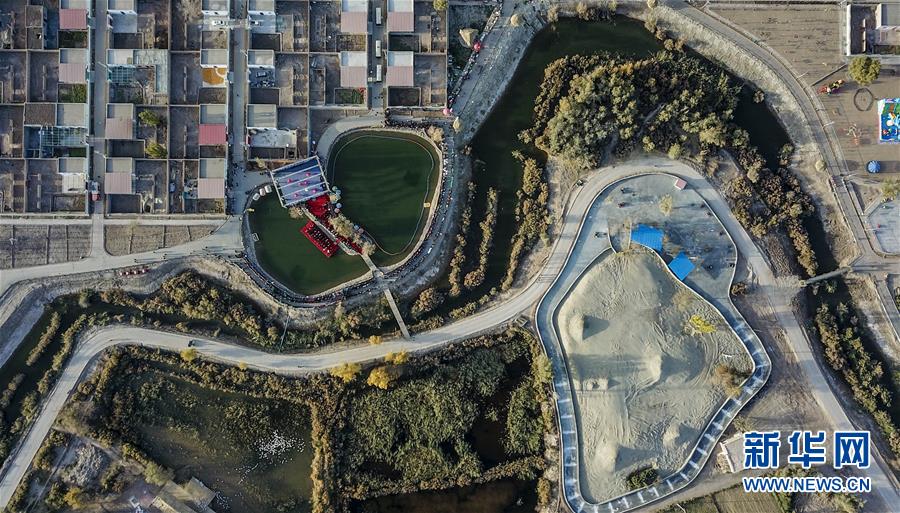 新疆巴楚县阿纳库勒乡果勒买里村滨河体育文化公园(10月22日无人机拍摄)。 新疆巴楚县阿纳库勒乡果勒买里村紧邻巴楚县城,区位优势明显。近年来,新疆维吾尔自治区体育局“访民情”“惠民生”“聚民心”驻村工作队帮助村里完善基础设施和改善村容村貌,借助节庆活动大力发展乡村旅游,吸引周边及外地游客前来观光休闲,既丰富了村民的文化生活,又为村民增收致富拓宽了门路。 新华社记者 胡虎虎 摄