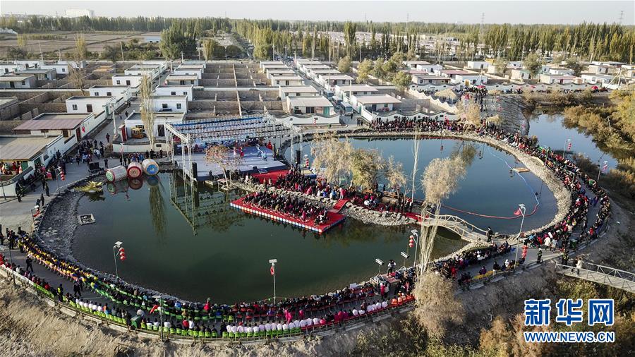 10月22日,在果勒买里村,游客和村民在观看演出(无人机拍摄)。 新疆巴楚县阿纳库勒乡果勒买里村紧邻巴楚县城,区位优势明显。近年来,新疆维吾尔自治区体育局“访民情”“惠民生”“聚民心”驻村工作队帮助村里完善基础设施和改善村容村貌,借助节庆活动大力发展乡村旅游,吸引周边及外地游客前来观光休闲,既丰富了村民的文化生活,又为村民增收致富拓宽了门路。 新华社记者 胡虎虎 摄