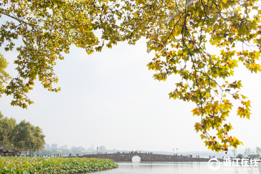 杭州最多彩、最浪漫的季节到了!10月23日,杭州北山路已是一片“金黄” 。道路旁的梧桐树上,枝头叶片已由绿逐渐变黄,各种颜色渲染交织,犹如一幅油画。(浙江在线记者 于诗奇 摄)