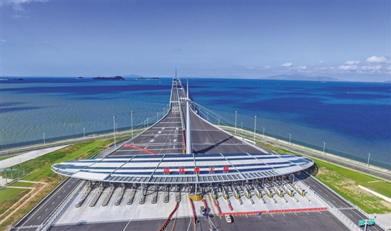 完成通关旅检,则进入在珠海口岸东侧的港珠澳大桥主线收费站,空中俯瞰,收费站犹如开弓之弦,蓄势待发。