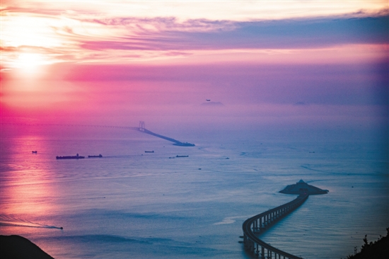 落霞映照,波光粼粼,港珠澳大桥岛隧工程如梦如幻