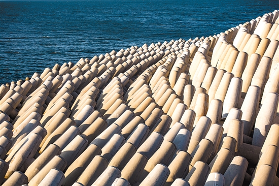 扭工字块潜堤等保证基础承载力均匀过渡,低潮位时可见扭工字块露出水面