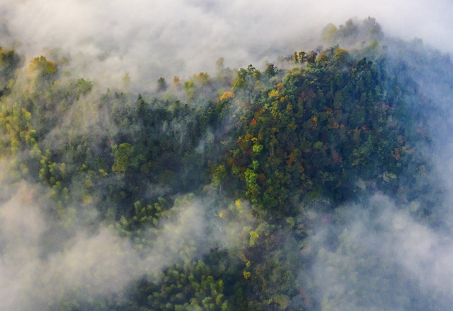 这是10月24日航拍的霍山县单龙寺镇扫帚河村秋景。