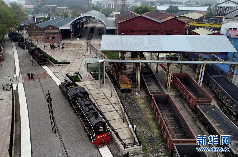 10月25日,游客在唐山市开滦国家矿山公园蒸汽机车观光园参观(无人机拍摄)。