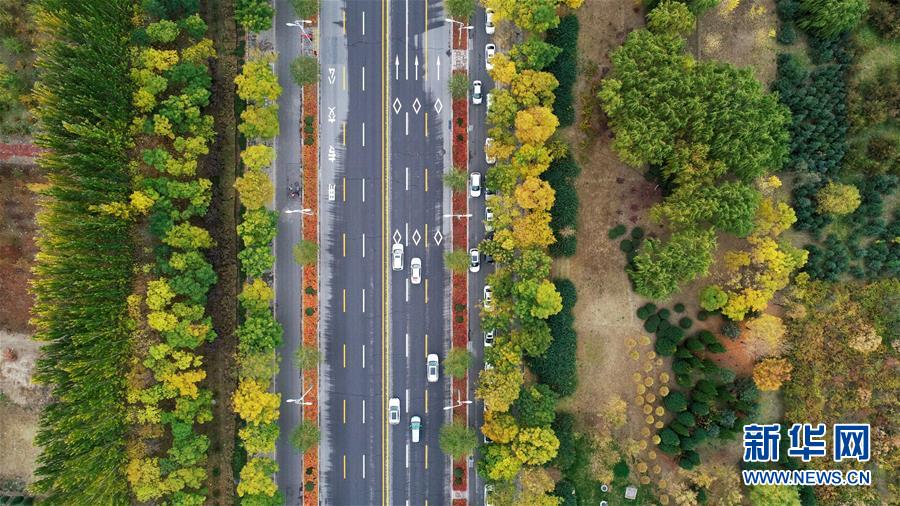 宁夏银川市凤凰公园秋景(10月20日无人机拍摄)。