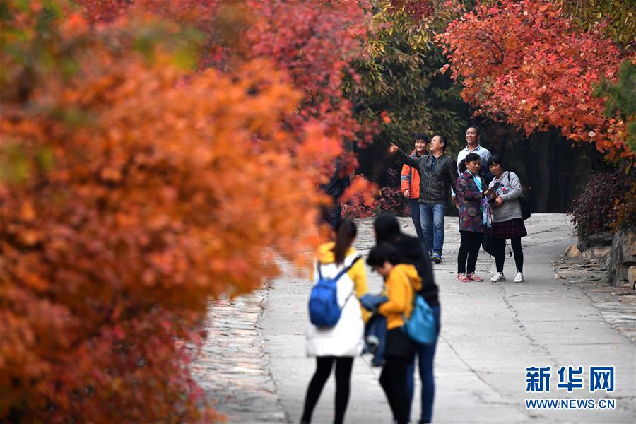 10月25日,游客沿着山路观赏红叶。 金秋十月,北京西山八大处公园的山间、路边层林尽染,秋色正浓。 新华社记者李俊东摄