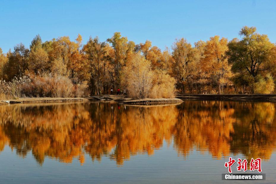 十月下旬,甘肃酒泉市金塔沙漠胡杨林景区叶片金黄,在湛蓝的天空下,恍若仙境。杨志彬 摄