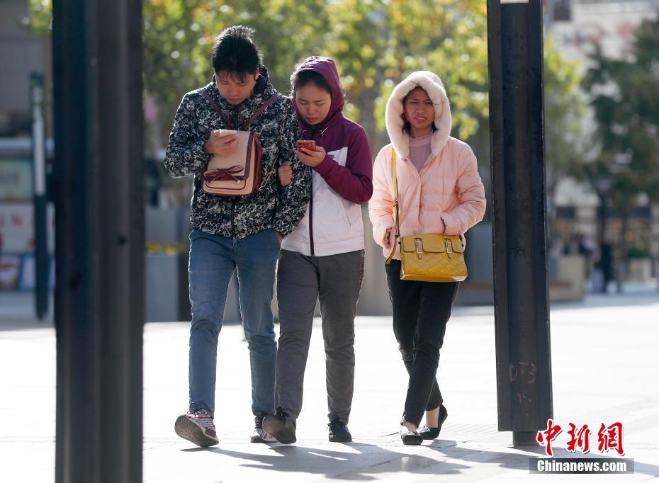 10月26日,北京王府井步行街,市民包裹严实在风中出行。中国天气网发布消息称,北京当日北风四五级,阵风七级左右,大风蓝色预警持续。中新社记者 刘关关 摄